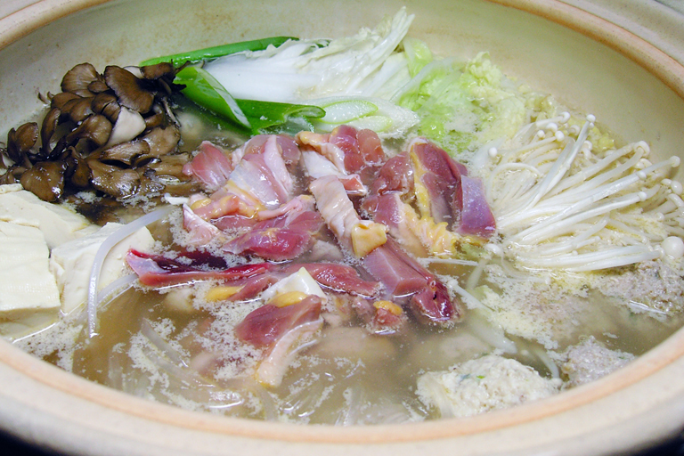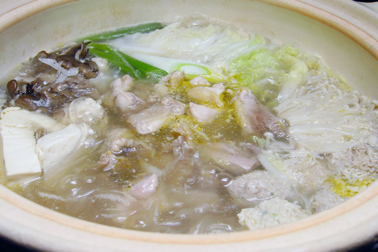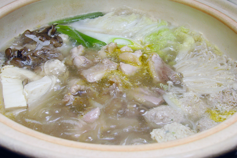 煮立った濃厚な鶏がらスープに骨なしの地鶏をさっとくぐらす程度でポン酢または、塩でいただくもので、新鮮な地鶏肉をしゃぶしゃぶ風にすることで、地鶏本来の味、風味、ジューシーさと絡み合った濃厚スープの旨さを一度に楽しむことが出来ます。