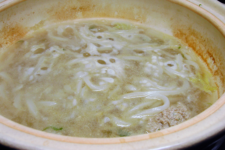 <7>雑炊までいかれる方は、煮込んだうどん(コシのあるさぬき等)をスープは入れず碗に取り、醤油(香りのよい生醤油がおすすめ)をかけ、たっぷりの鰹節、刻み葱好みで卵黄をのせ、よくまぜていただきます。