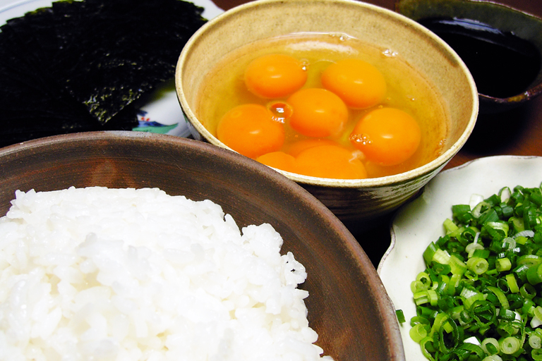 御飯・生卵(5,6個)・刻みねぎ・海苔・ポン酢・塩。