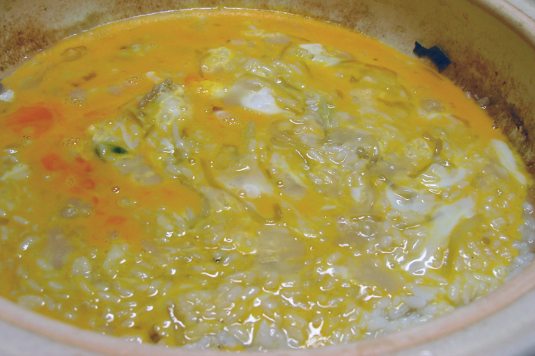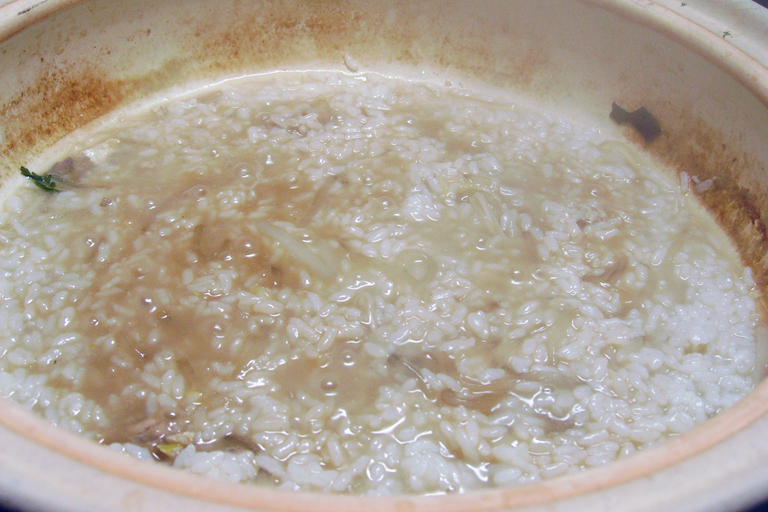 <2>残った具は、全部取り除いて、スープが少しかぶる程度に御飯をいれて、ポン酢か塩で薄味をつけ、写真のようにくつくつとなったら火を止めます。ここからの作業は、スピーディに・・