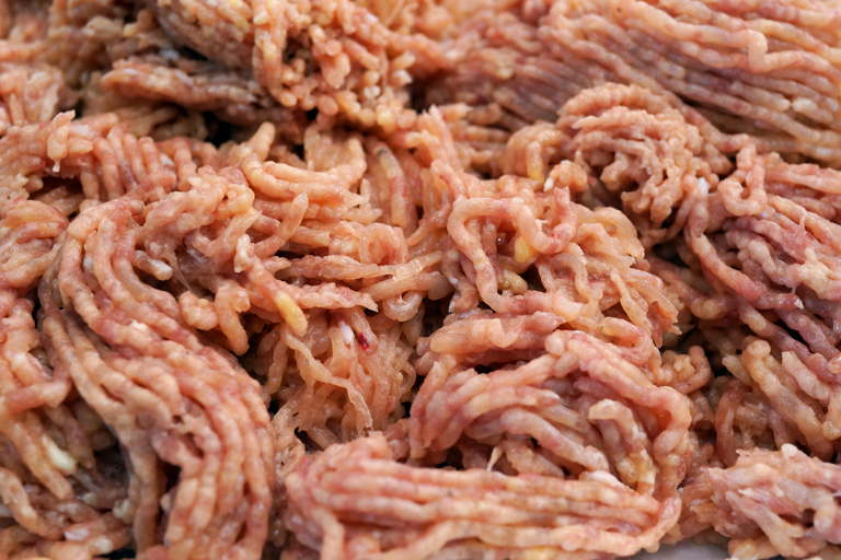 淡海地鶏の皮付のもも肉とむね肉の一度挽き冷凍ミンチ。